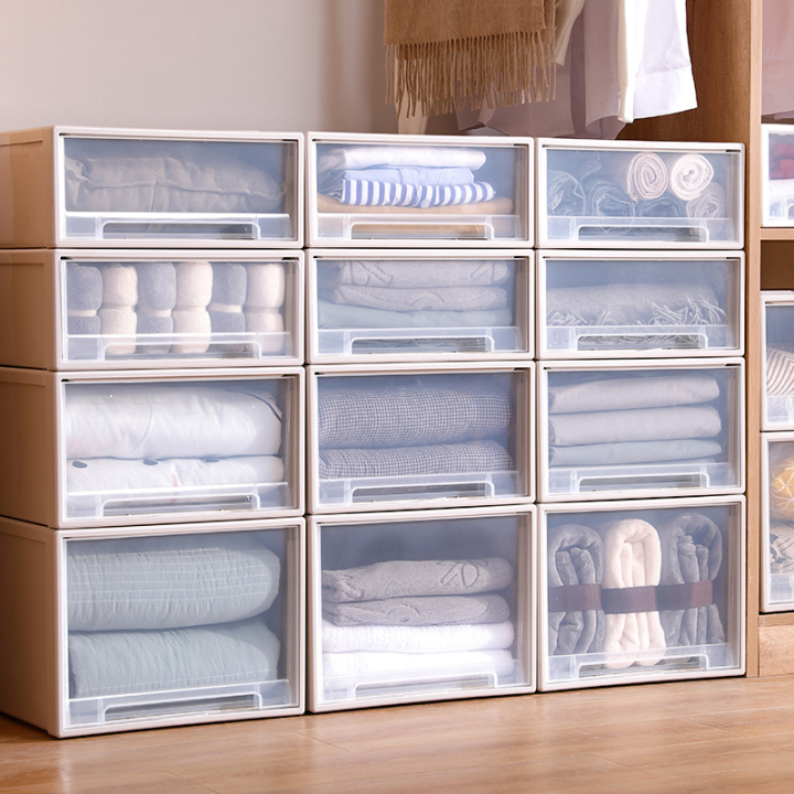 抽屜式收納箱可以靈活適應于所有的衣柜,對于這種步入式衣柜,抽屜式收納盒正好也彌補衣服不好疊放的空缺。