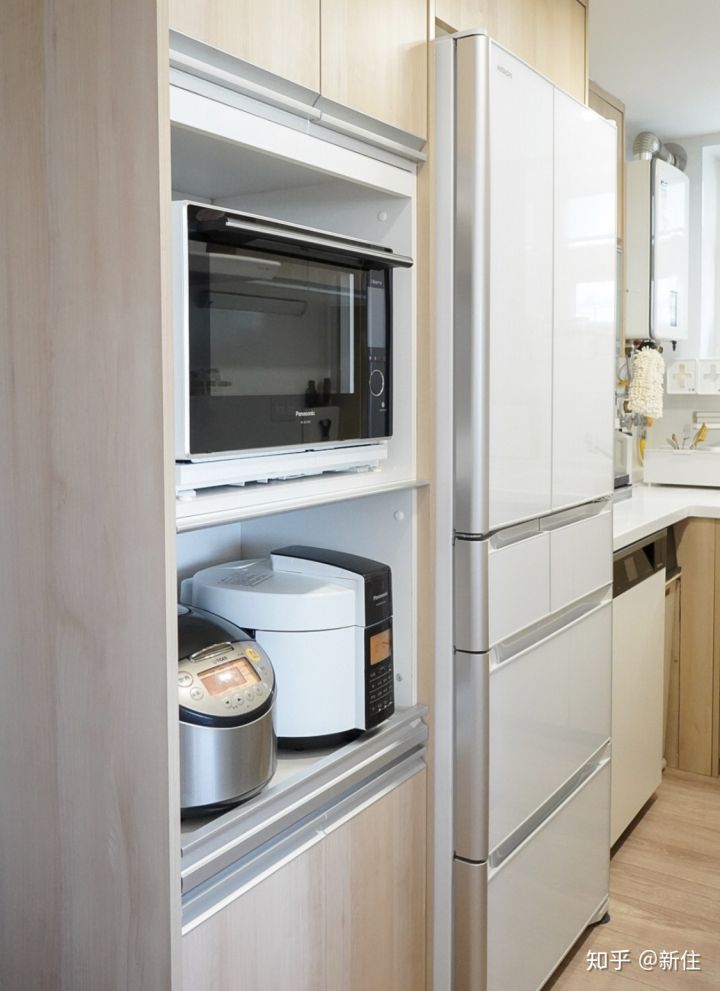 如果廚房空間足夠,定制高柜是不錯的方式,可以把常用小家電都收納起來不說,還非常方便使用。
